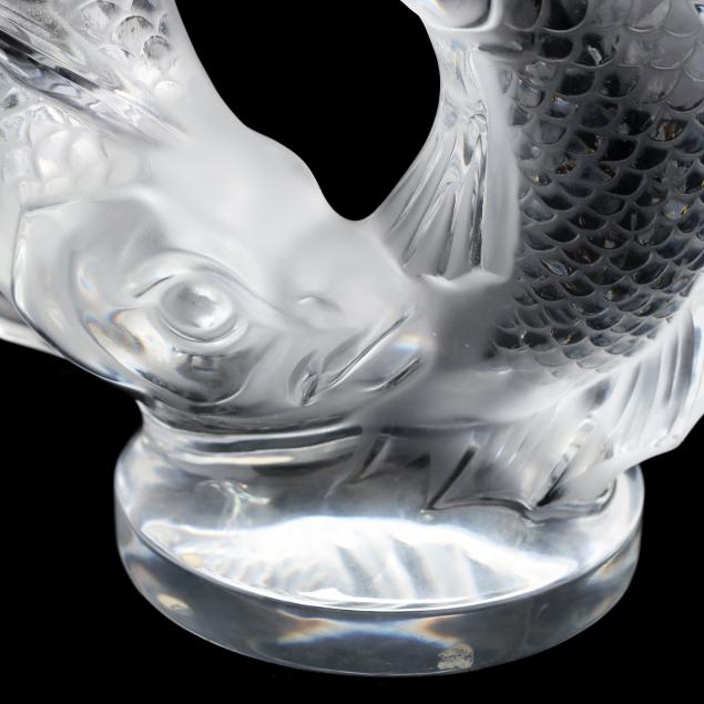 France, late 20th century, frosted and polished crystal of two intwined koi fish, signed and labeled, with box.