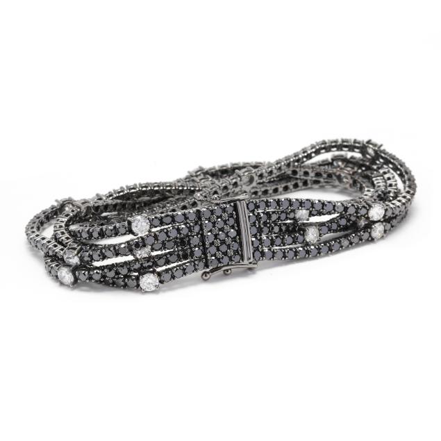 Bracelet comprised of five strands of round cut black diamonds weighing approximately 12.4 total carats with full cut round diamond stations weighing approximately 4.75 total carats (H-I color, I1-I2 clarity), completed with integrated clasp and double figure eight safety catches, stamped 14K.