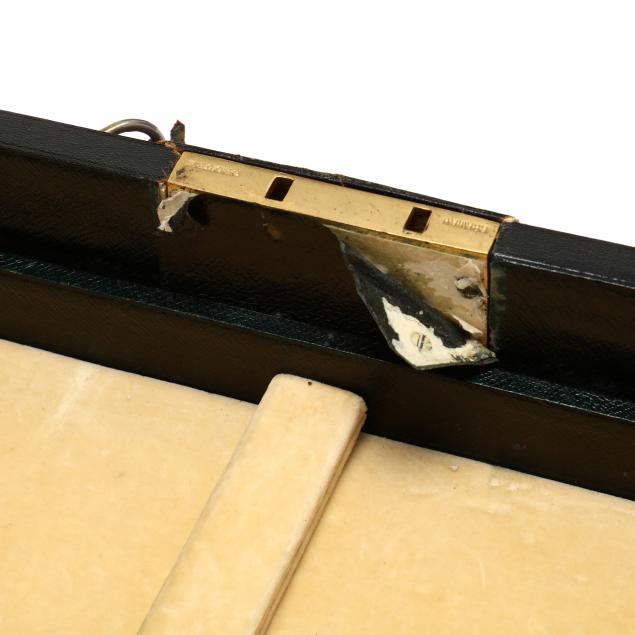 Collection of a Lady, Memphis, Tennessee Wear to green leather exterior and interior including cracking to handle, scuffing to corners, and peeling to the interior lining. Wear to gold-tone hardware at handle. Protective cover with some tears and wear to corners, possibly lacking some original cushions, does not retain key.