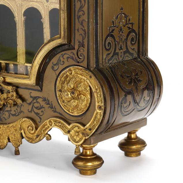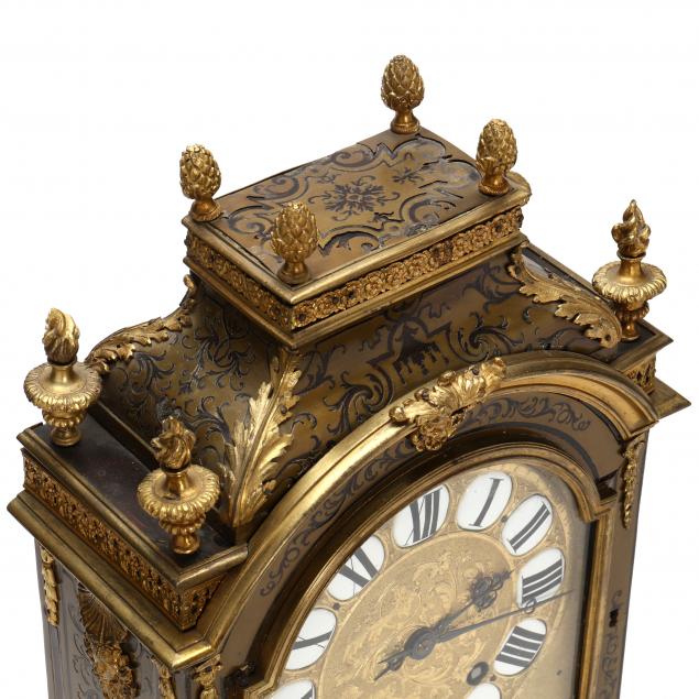 Some scattered inlay lifting and inlay losses, with some areas of associated restoration; artichoke finials are later replacements; old but likely later pendulum; some cracks to lower side of case (appears stable); later glass to door; some mis-shaping to upper pediment moldings; some later nails to ormolu mounts; rear count wheel activates bell chime when tested; unknown if in proper working condition. Please See Terms and Conditions of Sale: Clocks and Watches.