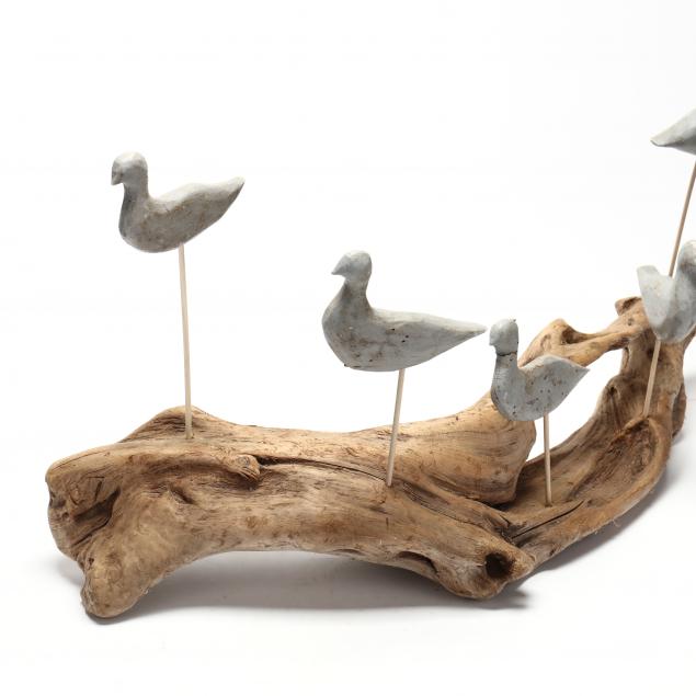 An extremely rare composition of five rig mate peeps, each bird carved from a single piece of wood. Maker is unknown but they were collected from Atlantic, North Carolina.