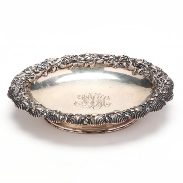 Circa 1873-1891, directorship of Edward Moore, pattern number 7382, oval form with shell and kelp decorated repousse rim, script monogram to center.