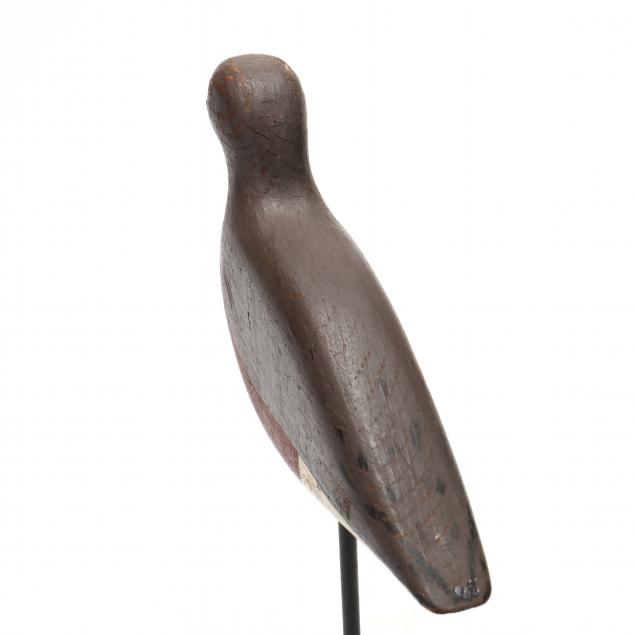 Lambert Morris was from the small fishing village of Atlantic, North Carolina. He loved working the water of Core Sound but attended Trinity College (now Duke University) and Law School. His law practice would eventually lead him back to Carteret County as a judge. The love of working the water never left him. He made several different stands of beach robin decoys mostly influenced by Alvin Harris. This exceptional beach robin is one of the finest known by Lambert Morris. It has carved and painted eyes with strong original paint.