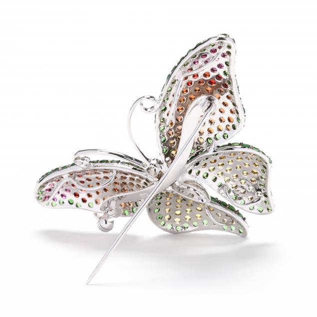 The brightly colored butterfly brooch fully set with round cut rubies, pink, orange, yellow, and colorless sapphires, and diamond melee and with tsavorite garnets defining the outline to the wings, completed with a single locking pin stem, stamped 18K and with a maker's signature.