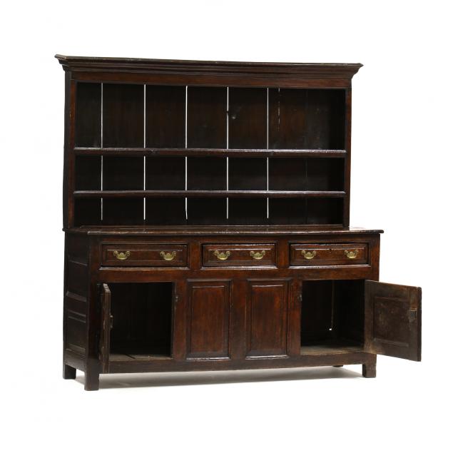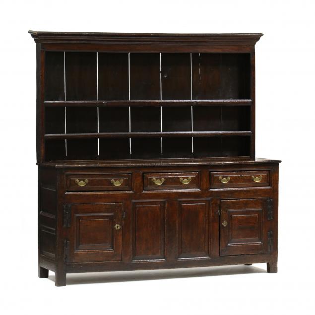 Early 18th century, two part form, some mixed woods including oak, oak and mixed woods secondary, the open stepped back rack featuring a cove molded applied cornice, two open shelves with applied molded strip, lower plate rail, the dresser with three side by side raised panel drawers with molded drawer case with two central raised panels flanked by two hinged raised panel cabinet doors, each side with double raised panel, straight feet.