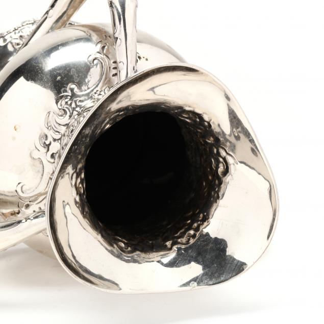 Likely American, marked sterling, by an unknown maker, pattern code 6134, foliate repousse to neck, three twisted handles, flared wavy rim, raised on stepped round pedestal foot with cartouche decoration, engraved to underside "AS / AND / DHM / 1865".
