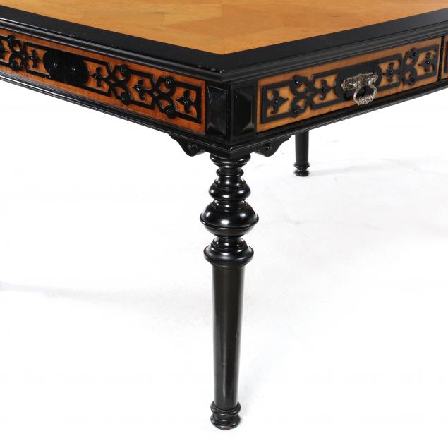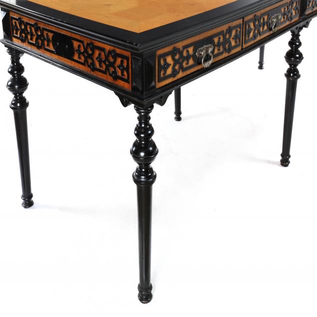 Circa 1900, one part form, maple veneer with black lacquered highlights, pine and oak secondary, rectangular flush top with ebonized border surrounding a birds-eye-maple parquetry inlaid top creating geometric cube patterns, the skirt featuring eight drawers with birds-eye-maple veneers having applied ebonized fretwork, silver tone cast metal pulls, repeating fretwork panel sides, raised on six ring turned and tapered legs.