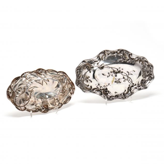 The larger with mark of William B. Kerr & Co., pattern number 711, with scrolling foliate decoration throughout and wavy rim (13 1/2 x 9 in); the smaller with mark of Simons Brothers, pattern number 1757, with lily and leaf decoration throughout (11 1/2 x 7 in).