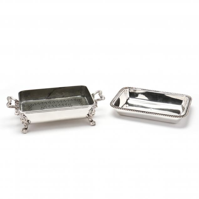Circa late 18th/early 19th century, with twin stars or twin suns mark to underside, rectangular form dish with pierced interior set with a warming insert having a gadrooned rim (also stamped with twin suns mark), lion form double handles, raised on (4) paw feet, topped with a domed lid with a rocailles top handle, stag monogram to lid.