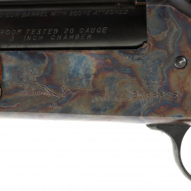 Serial number B396645 on the receiver, 24 in. blued barrels marked 22 LONG RIFLE AND PROOF TESTED 20 GAUGE 3 INCH CHAMBER and SAVAGE ARMS WESTFIELD MASS U.S.A., color case hardened receiver marked SAVAGE 24D / SERIES P with engraved running fox and turkey, barrel is choked IM, barrel selector on hammer, checkered walnut stock and forend with ribbed butt plate. LOP 14.25 in.