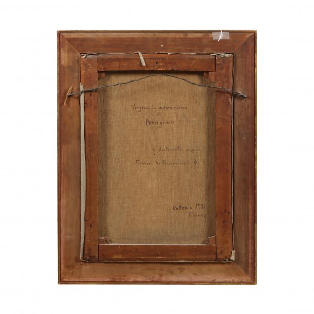 Oil on canvas, inscribed en verso in Italian, signed at lower left "G. Bertoncelli / Copio", painted by Guillio Bertoncelli (Florence, 1880-1920) after the original painting once housed at the Pitti Palace in Florence, presented in a textured and incised giltwood frame.