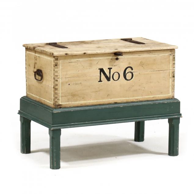 20th century, two part form, pine dovetailed case with cream wash, marked No 6, iron hinges at lid, open interior, applied handles to sides, green painted conforming frame with straight legs.