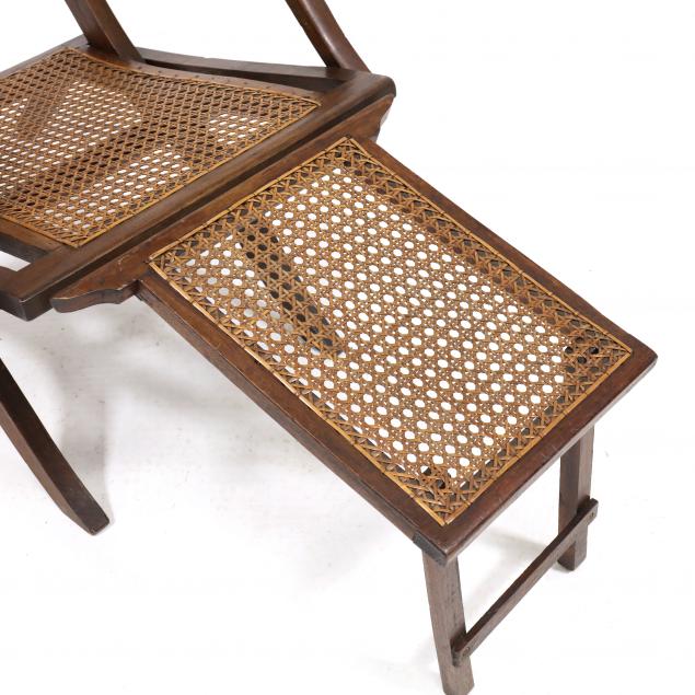 Marked "Collingnon's Patent, June 27, 1871", crest with burl veneered shield, incised decoration, cane back, seat and foot rest, shaped arms, folds flat.