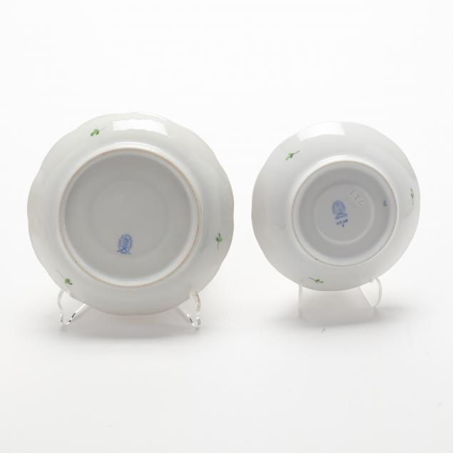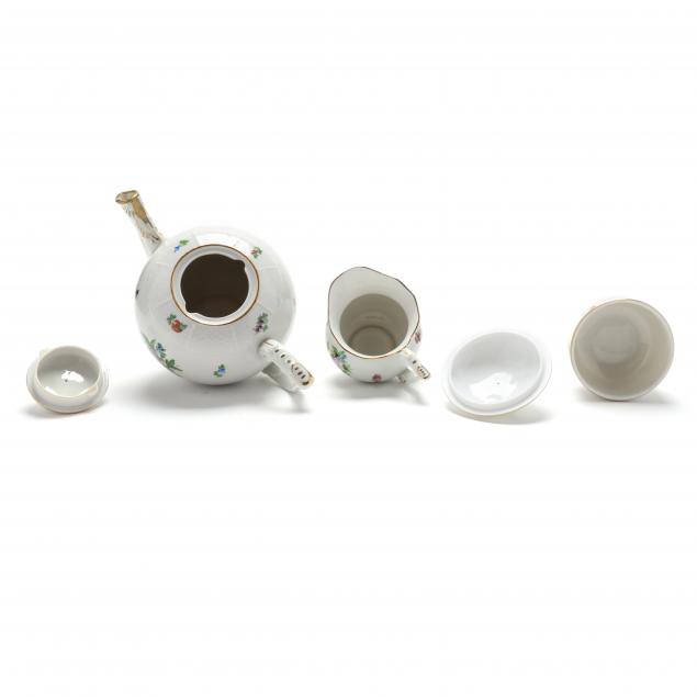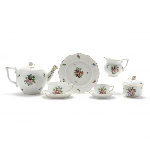 Made in Hungary, includes (8) salad plates (7 1/2 in.); (8) tea cups, and (8) saucers; (7) mocha cups and (8) conforming saucers; a creamer; a lidded sugar bowl; and a teapot (5 x 9 x 6 in.).