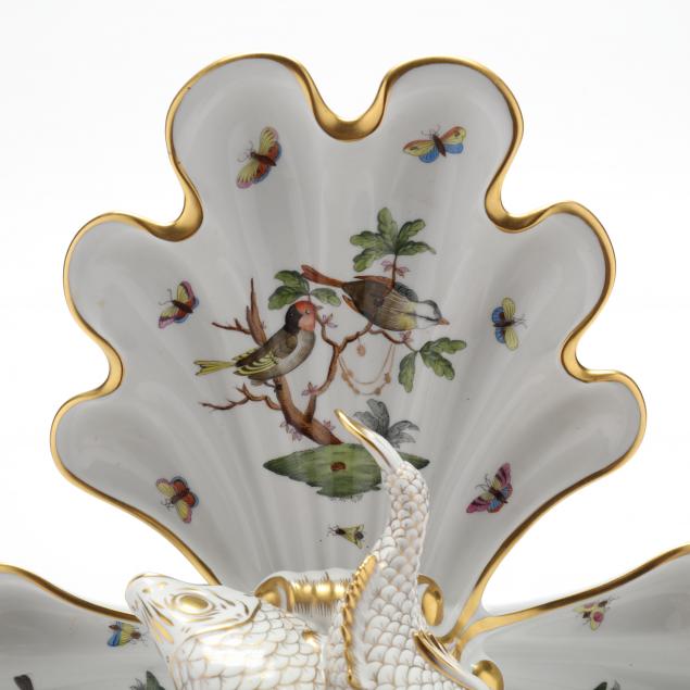 Centered with two full bodied fish, the whole accented with gold.