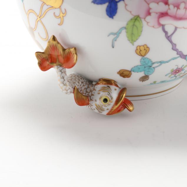 6419, with cover, adorned with (6) applied dolphins over a chinoiserie floral body, gilt accents, and a domed cover with a dolphin finial. With backstamp.