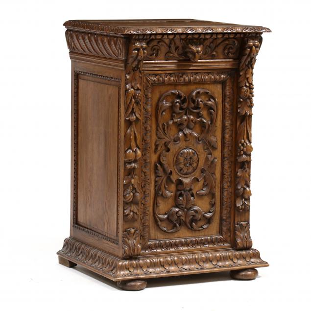Likely Belgium, early 20th century, top with applied gadrooned edge, single drawer with lion mask pull over a hinged cabinet door with high relief carved rosette, scroll and foliate motifs, raised panel sides, applied acanthus leaf molded base on suppressed ball feet.