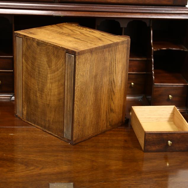 Late 20th century, solid mahogany, two-part form, finish no. 29, upper case with molded cornice above two hinged shaped beveled glass panels, shelved interior, lower case with a hinged slant front lid opening to reveal divided and drawered compartments including a central prospect cabinet which opens to reveal a divided and drawered compartment, which when the drawer is removed the prospect cabinet can be loosened by pressing down on a cut-out panel to the drawer support board, when removed the prospect cabinet has two rear hidden document drawers which are opened by pressing a suspension panel to the underside of the case and when these are removed a further subsequent small hidden drawer can be opened at the base, the lower cabinet with four graduated lipped drawers, case sides with brass handles, raised on ogee bracket feet, labeled.
