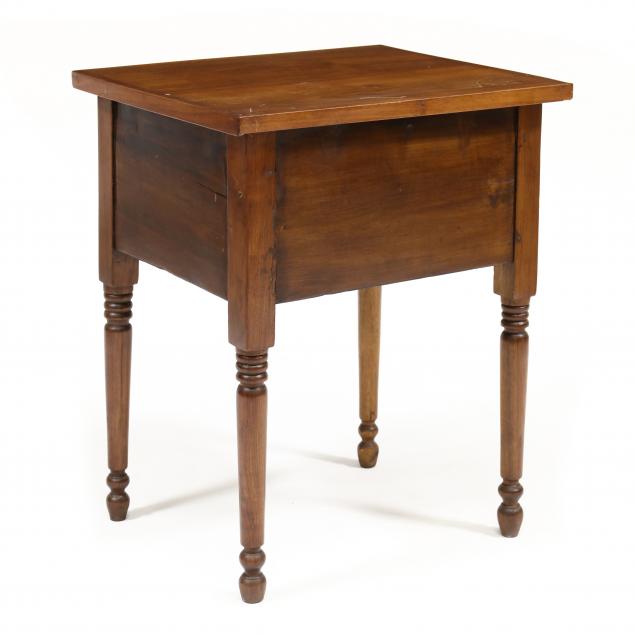 Mid 19th century, poplar secondary, top with applied edge, two flush drawers, ring turned tapered legs.