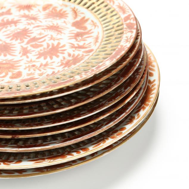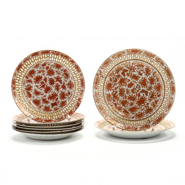 19th century, porcelain hand painted in iron red and gilt highlights with birds, flowers, butterflies, and fruit, reticulated gilt border, includes six plates (8 in. diameter) (two with rim chips) and two larger plates (9 in. diameter) (good estate condition).