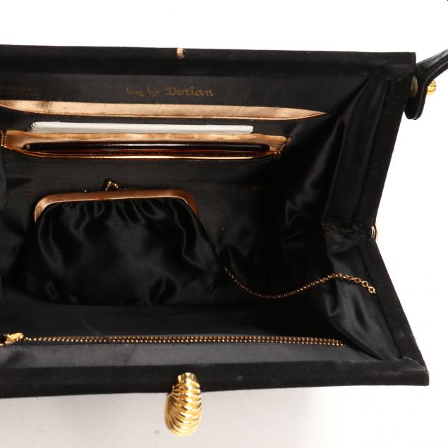 The first and second are made by Mark Cross, with flexible top handles and flip top closures. The brown leather bag has a leather interior with pockets and matching change purse (tarnish to the metal; musty odor; lower edge wear) (7 x 10 1/4 in.); the second is black leather with soiled interior; bent handle; edge wear; loss of plating) (8 x 10 1/4 in.). The third bag, labeled "made by Dorian", is composed of black suede with a shell clasp, having an open interior with pockets for mirror and comb, a change purse is attached by a slim chain (good vintage condition; wear to the silk trim on the change purse) (7 3/4 x 9 1/4 in.).