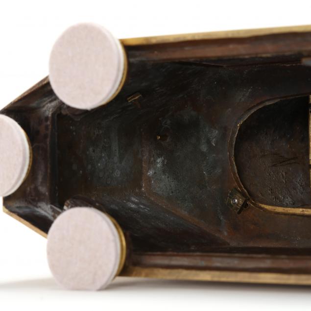 Circa 1800, figuring Eros forging love’s arrows at his anvil, with round white enamel dial signed “Chatenay a Versailles,” with Roman chapters and Breguet hands, set within a tree stump that holds forging file, tongs, and hammers, the eight-day silk suspension movement numbered S8 11, lozenge sarcophagus form plinth with relief scene of two putti at a beehive, flanked by torche and quiver mounts. Includes pendulum, key, custom later acrylic display cloche, and text by Elke Niehüser,