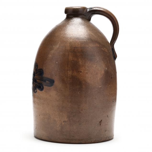 American, late 19th century, stoneware cylinder with handle and rounded spout, with an 8"-long brushed cobalt floral decoration, stamped "M. & T. MILLER / NEWPORT, PA / 2," with maker's mark, capacity mark, and top and bottom of handle highlighted in cobalt blue.