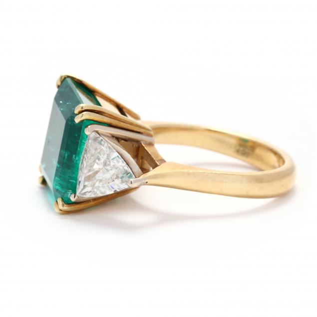 the prong set square emerald cut emerald (14.58 x 14.38 x 10.68 mm) weighing approximately 15.4 carats set between two trillion cut diamonds weighing approximately 4.5 total carats (J-K color, SI2-I1 clarity), stamped 18K. With AGL Document stating emerald with modern minor clarity enhancement with very good to good color stability and Colombia as country of origin.