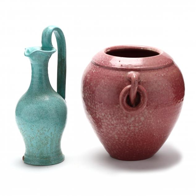 At J.B. Cole Pottery, earthenware, a ring handled urn (11 1/2 x 10 in.) and a Rebecca pitcher (14 1/2 in.) (1 1/2 in. base rim chip), not signed.