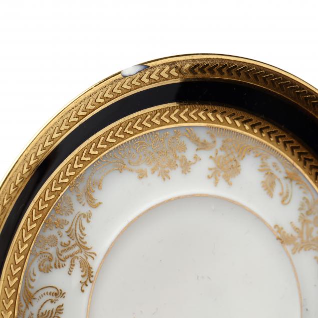 Bavaria, (72) pieces, the delicate leafy gilt design bordered by a wide gold encrusted border with black contrast band, to include: (12) dinner plates (10 in.), (12) salad plates (7 3/4 in.), (12) dessert plates (6 3/4 in.), (12) bread & butter plates, (12) coffee cups with (12) saucers, (6) demitasse cups with (6) saucers., all with Selb-Bavaria baclkstamp.