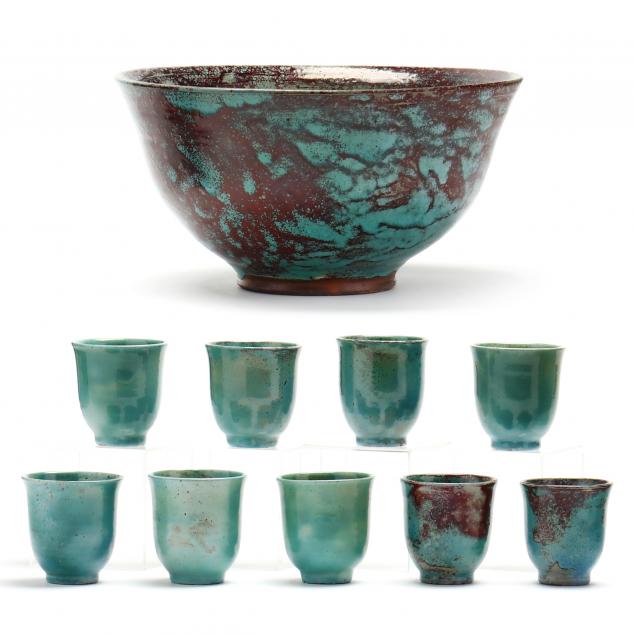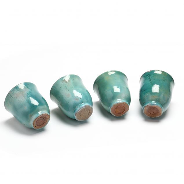 1930s-40s, the footed bowl features an exceptional variegation of the Chinese Blue glaze (6 3/4 x 13 1/8 in.) accompanied by noggins (each 3 1/2 in.) all with Jugtown stamp.
