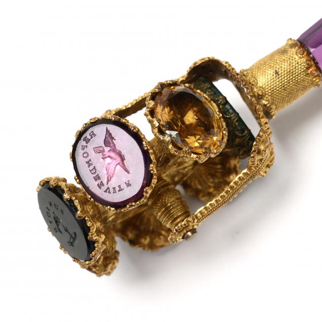 Mid-19th century, attributed to Palais Royal, unmarked, both spinning handled forms featuring (7) intaglio seals carved in amethyst, bloodstone, citrine, black onyx, quartz and more, the first with faceted amethyst handle, seals engraved with phrases and associated pictorial designs (4 in.); the second with finely cast handle depicting putti and goat climbing a grapevine branch, seals engraved with days of the week (5 7/8 in.).