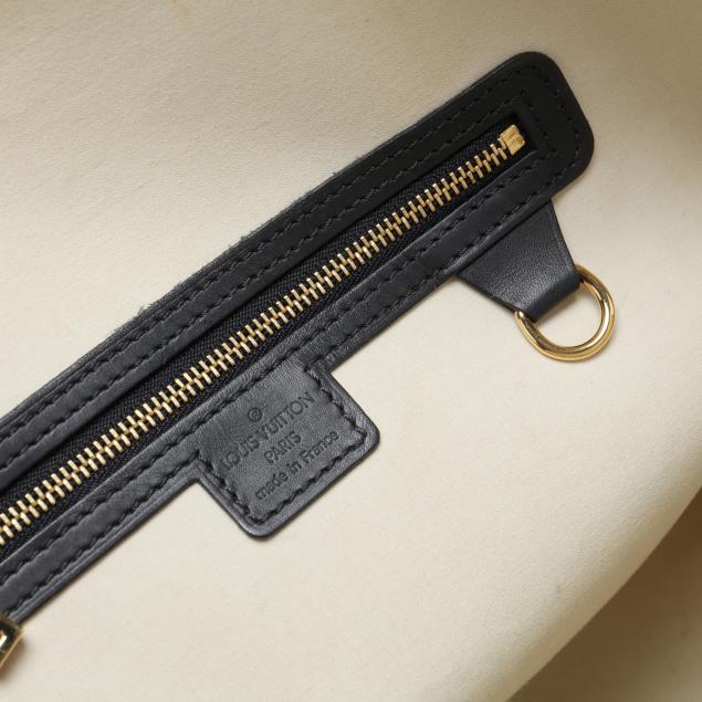 Mini Lin Alma Haute of monogram navy canvas with navy leather dual rolled handle and trim with brass hardware including protective underside feet. The 3/4 zipper opens to an interior with a zipper pocket, a patch pocket, and a D ring. Date code under the D ring AR0091. The second is also made in France, of monogram coated canvas with vachetta leather shoulder strap and trim. This bag features an open frontal pocket, a top zipper closure, a leather lined interior with a zipper pocket (7 x 10 x 3 in.)