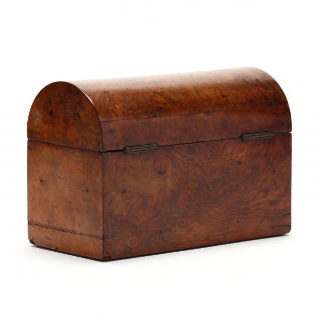 To include: the largest, 19th century, English, a tea caddy with burlwood veneers, domed top, brass inlays, and hinged, fabric-lined lid that opens to a divided interior with mahogany covers, compartments retain most of their original lead lining, marked "B & Co Improved" on hinge; the smaller, 20th century, rectangular shagreen, bone, and wood box, with hinged lid that opens to a divided interior, underside marked "KIRBY, BEARD & Co. PARIS," from an English maker of pins, needles, and hairpins (with stores in international locations).
