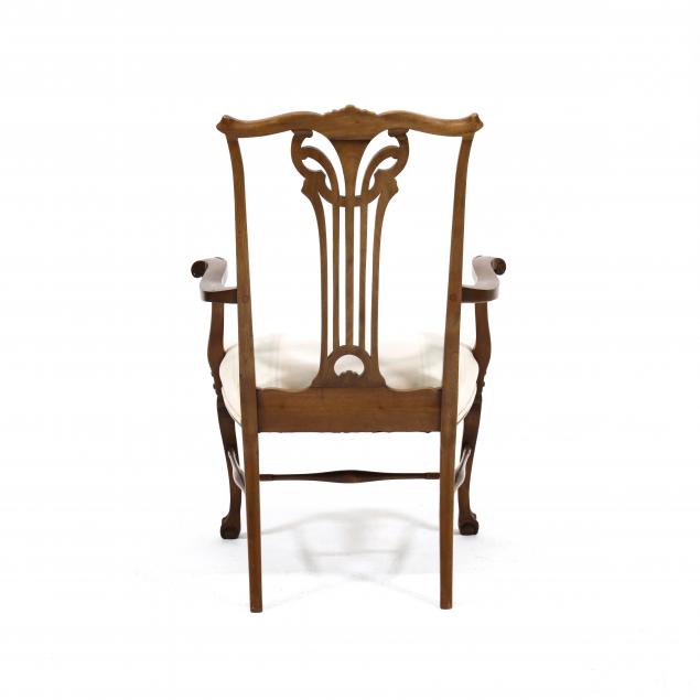 Early 20th century, including two armchairs and ten side chairs, all with shaped and relief carved crest rail, pierced and molded back splat, over upholstered serpentine seat, cabriole legs with acanthus carved knee, ball and claw front feet, turned stretcher base.