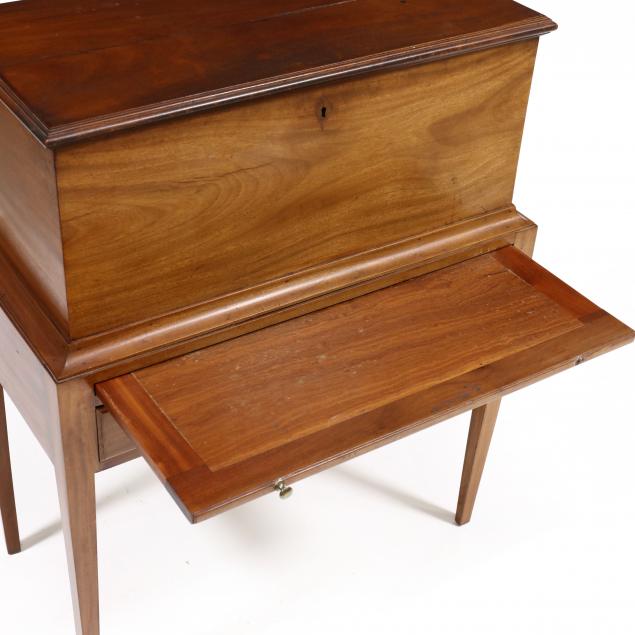Private Collection, Virginia Top with shrinkage crack; surface build up above escutcheon to lid; staining to interior of the cabinet and the drawer; mixing slide missing one pull and does not glide well.
