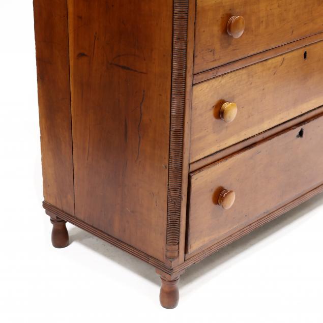 Circa 1830, poplar secondary with yellow pine drawer guides, top with applied convex reeded edge, four flush graduated drawers with scratch bead, repeating reeded corner columns, applied reeded base on turned feet.