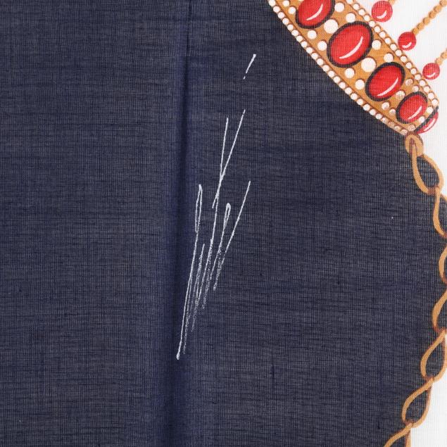 1980s, letter "L" design from the alphabet series, woman with leopard surrounded by jewels; the first larger, 100% silk, with tags that identify material, maker, and care information, signature towards center (35 x 35 in.); the second a small square with a Sevenarts Tokyo The Erte Gallery sticker on the back, signature upper right (19 1/2 x 19 1/2 in.), both unframed and in original packaging.