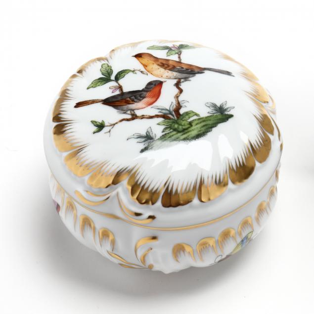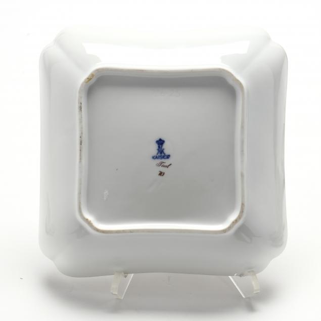 Including two lidded trinket boxes, a small tray and a small leaf shaped dish (1 1/2 x 4 in.). Included with these Herend pieces is a square dish with a similar design made by Kaiser Porcelain, Germany (1 3/4 x 7 3/4 in.), all marked.