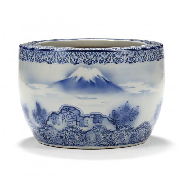 Circa 1900, porcelain with transferware in blue with landscape of young pine trees, the top rim and foot rim with floral pattern, key motif encircles the interior rim.