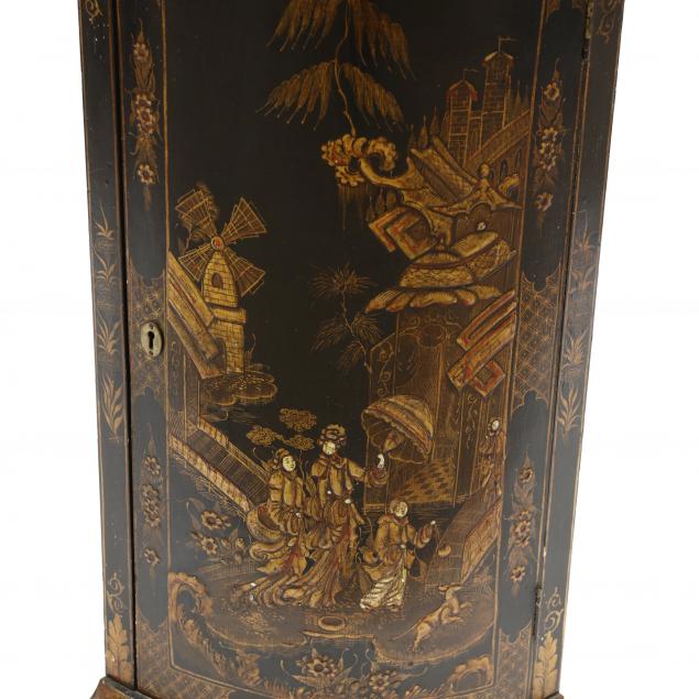 First half 20th century, black lacquer with gilt highlights, bow-front form, single hinged door with shelved interior, flush molded base.
