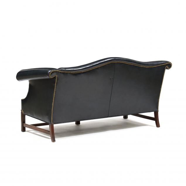 Mid to late 20th century, dark blue leather upholstery with brass nail head trim, single loose seat cushion, molded straight mahogany legs with stretcher base, labeled.