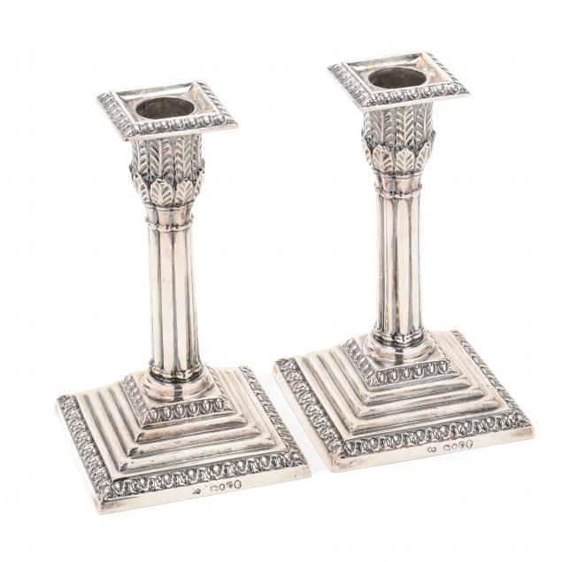 London (1878), neoclassical fluted column form with acanthus leaf capitals raised on a stepped square base with conforming separate bobeche (both marked), without monograms, weighted; retaining receipt.