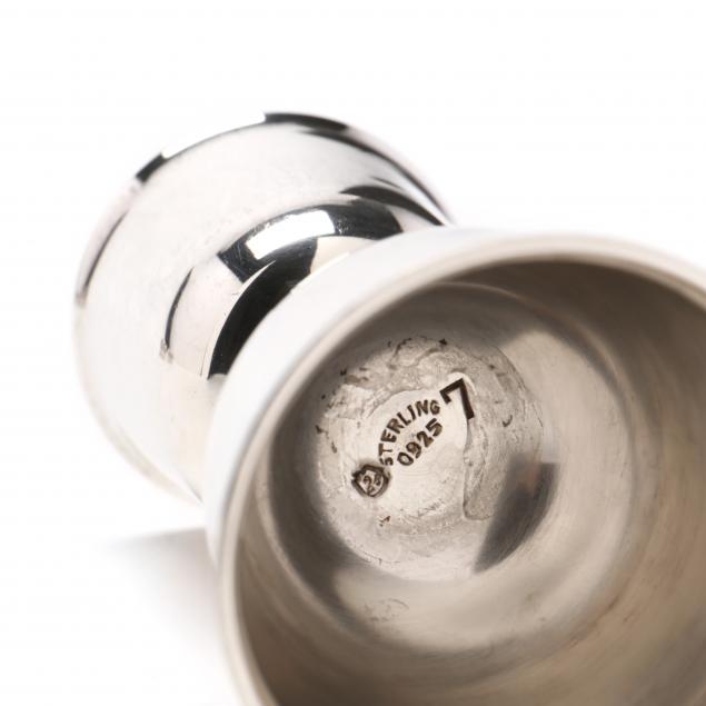 Including a double jigger, marked Sterling .925 to underside, unknown maker with eagle form mark (3 1/2 in.) (some scratches, else good condition); (6) individual salt and peppers, unknown maker, most marked .900 silver fineness to underside (1 1/4 in.) (some scratches and denting, signs of use to interiors). No monograms.