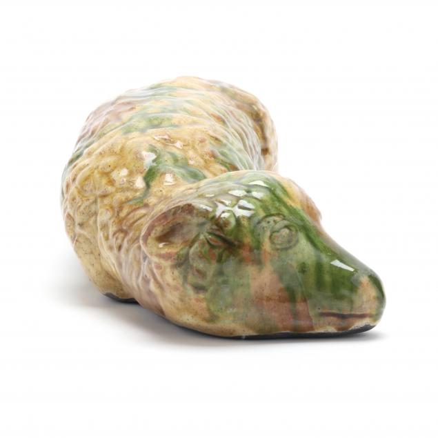 Polychrome glazed earthenware with slip, the first is a resting lamb doorstop after the multi-glaze example made at J. Eberly, Shenandoah Valley, late 19th century (10 1/2 in.) (good condition). The other two pieces are (2) decorated plates (11 in.). All pieces are signed on the underside; the plates bear a personal inscription in yellow slip.