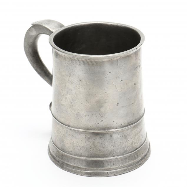 18th century, Connecticut or Philadelphia, tapering cylinder with low band, scrolled handle and molded base rim, interior base with encircled lion rampant touchmark between the initials T.D., used both by Thomas Danforth II (1755-1782) and Thomas Danforth III (1777-1783), upper rim marked "T.D" beneath crown.