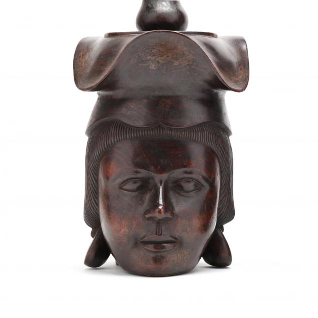 Mid-late 20th century, hand-carved wood, depicting a figural handled totem over a face vessel.