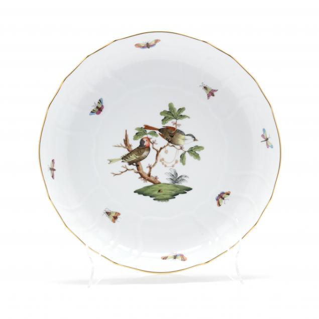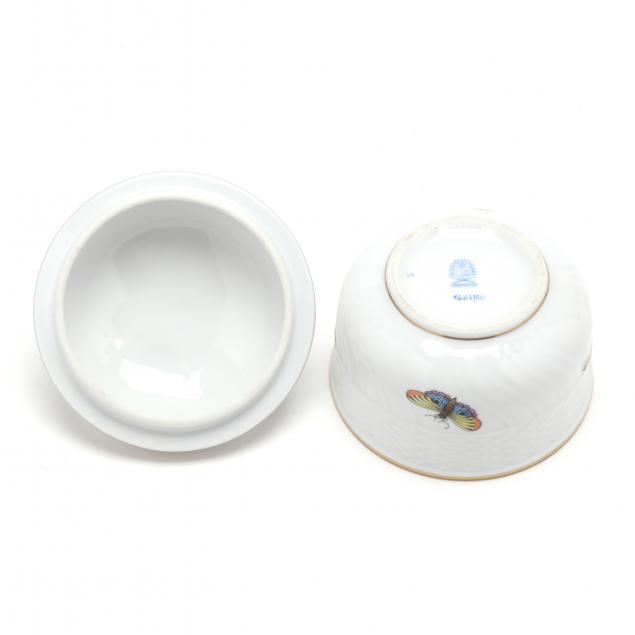 Hand-painted, gilded rims, to include a mini creamer (1644) (3 in.), a sugar bowl and lid (1663) (4 x 3 1/2 in. dia.), a square salad serving bowl (1180) (4 x 10 x 9 3/4 in.), and a round vegetable bowl (1082) (10 1/2 in. dia.), marked and inscribed with number to underside of each.