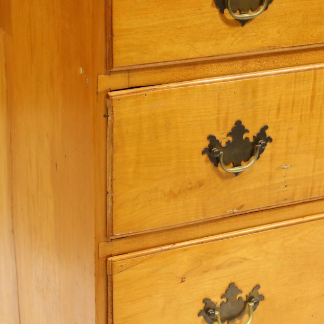 Four inch rectangular cut/patch/repair at top; later drawer guides; later pulls; rectangular patch and shrinkage crack to left side of case; feet are old and appear original; both right feet and the front left with crack and repair.