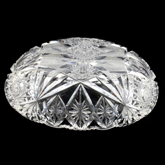 19th century, thick wheel cut and polished glass oval form with scalloped rim, hobstar and fan motif, signed to interior center.